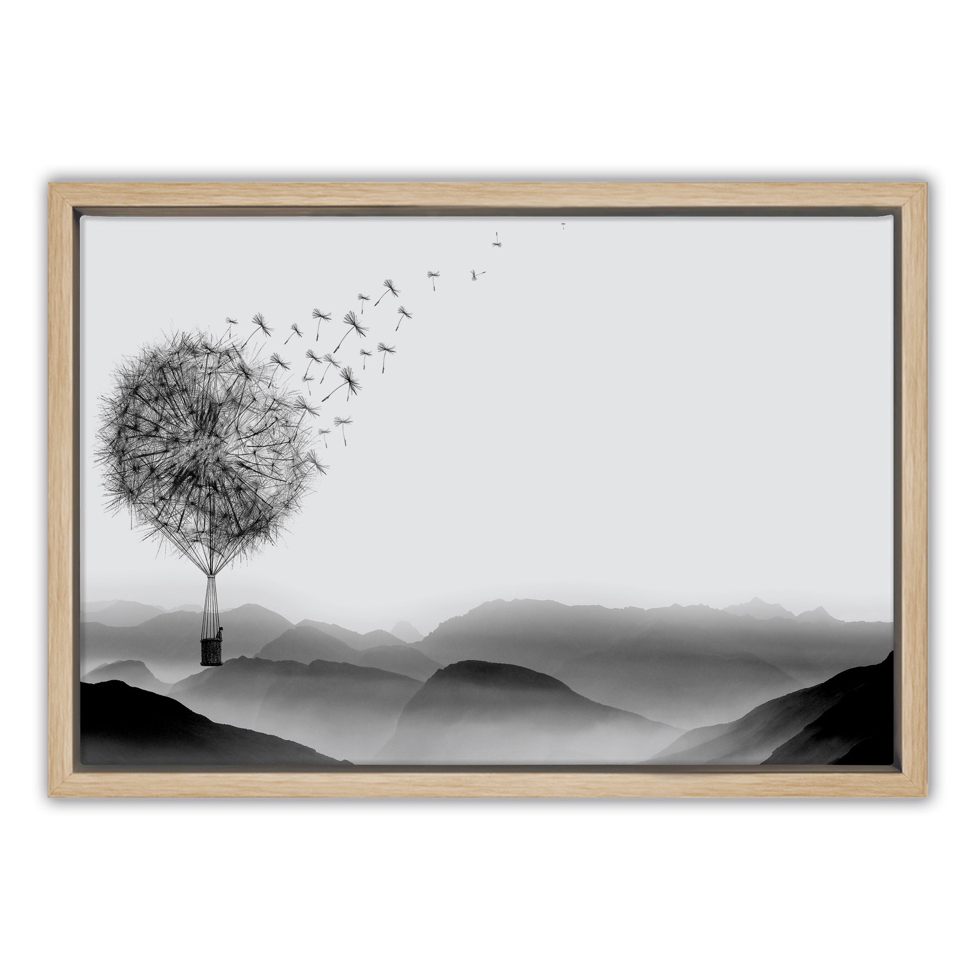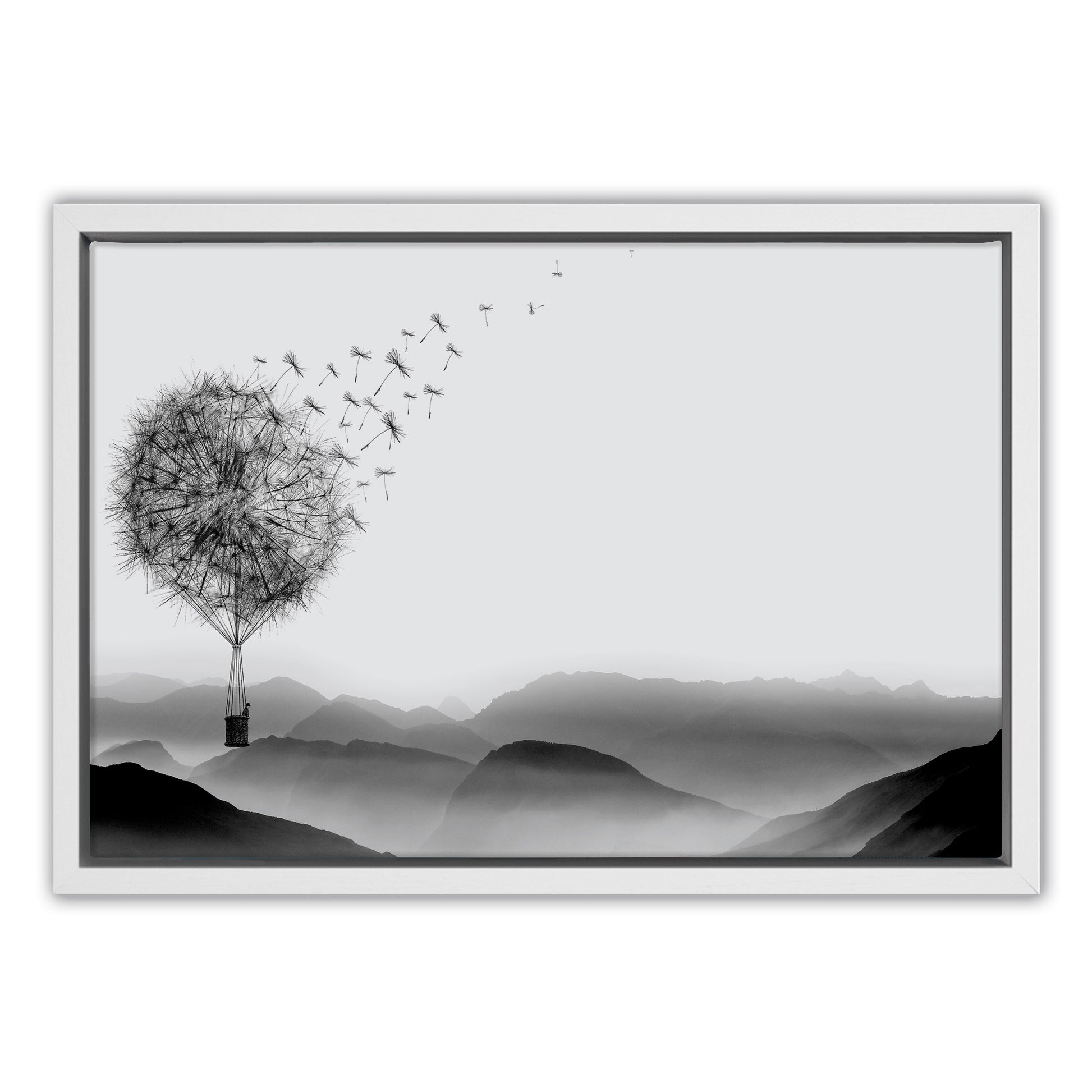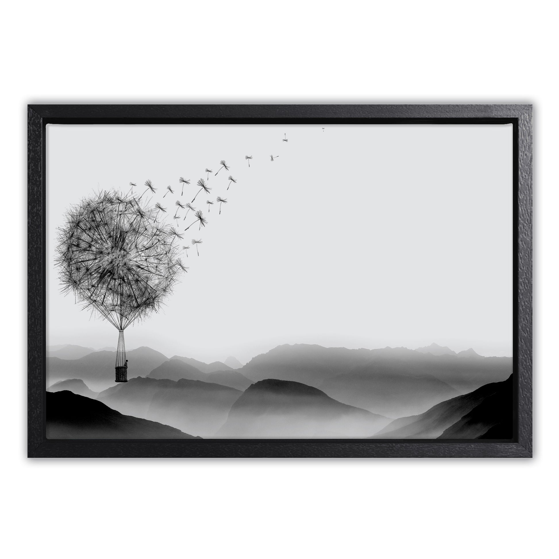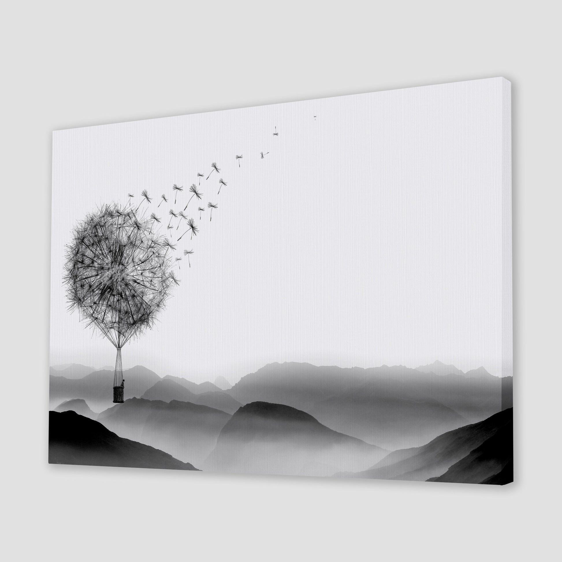 Drift into a world of whimsy with this enchanting canvas art piece. Delicate dandelions transform into a graceful hot air balloon, rendered in striking black and white tones that blend dreamy fantasy with timeless elegance. Perfect for adding a touch of imaginative charm to any room, this artwork captures the magic of floating freely through clouds. Whether you're decorating a bedroom, living space, or creative corner, this piece brings sophistication and wonder together in one captivating design.