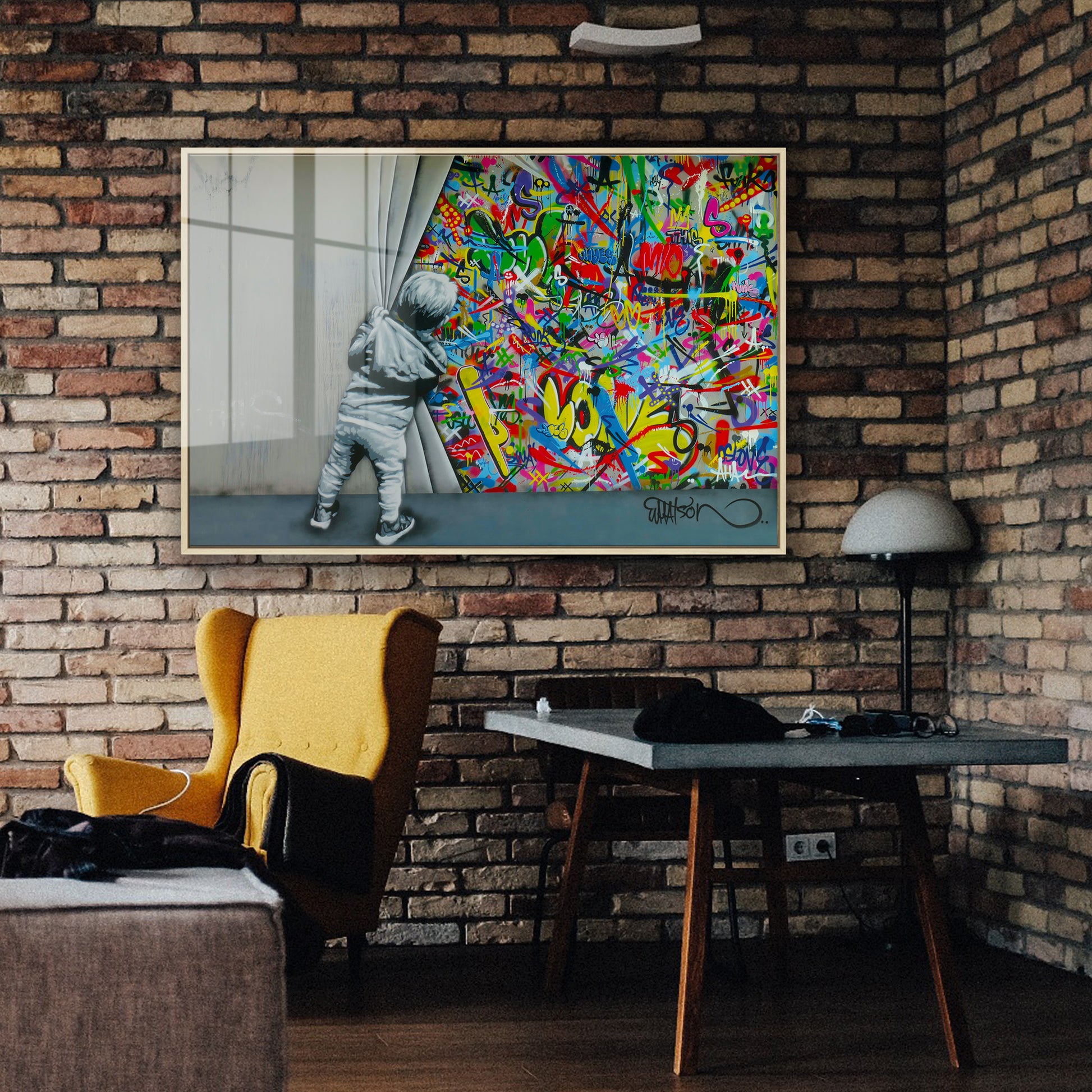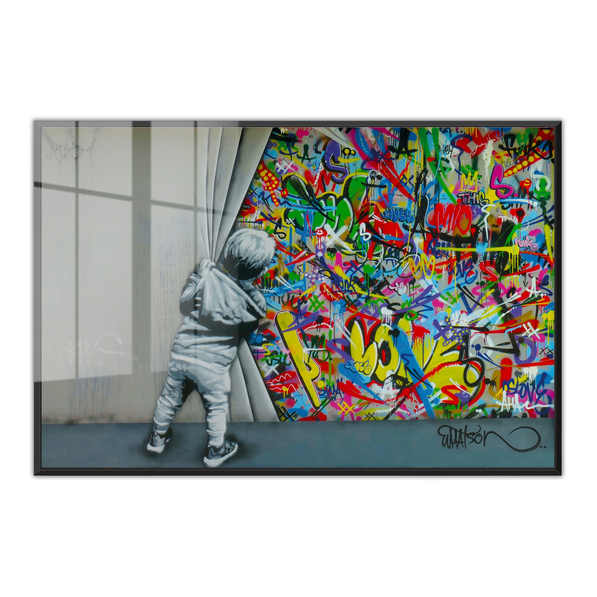 Bring cheeky street vibes into your space with this Behind the Curtain Graffiti Acrylic Art Print. Inspired by iconic Banksy style, it adds a quirky, bold twist to your home decor. Perfect for those who love a playful pop of urban edge mixed with artistic flair.