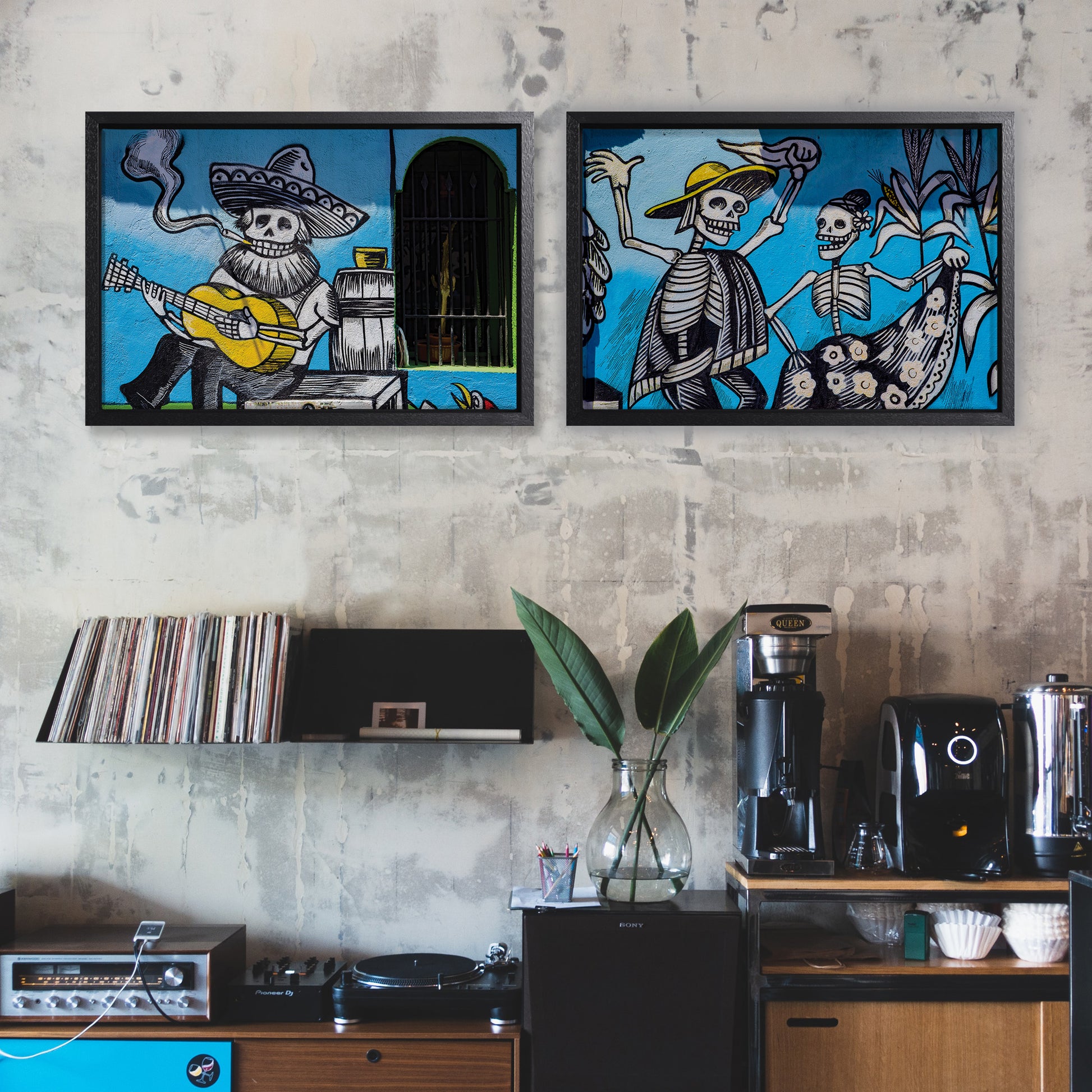 Celebrate the vibrant spirit of the Day of the Dead with this playful Dancing Bones Canvas Art Print. Featuring a quirky graffiti-style skeleton couple caught mid-dance, this unique artwork adds fun and character to any room. Perfect for those who love bold, different decor that sparks conversation and brings a lively, artistic twist to your home.