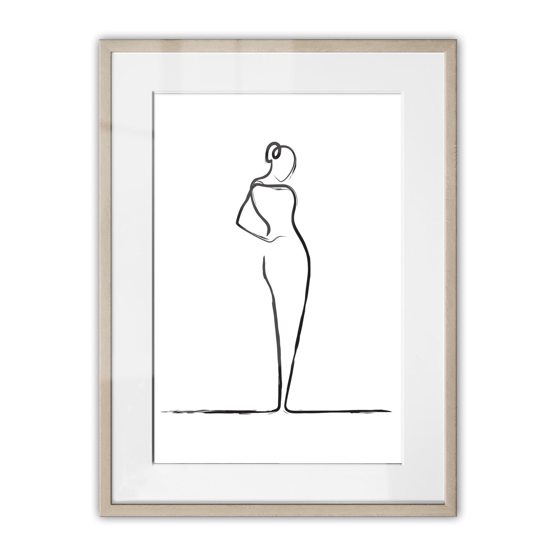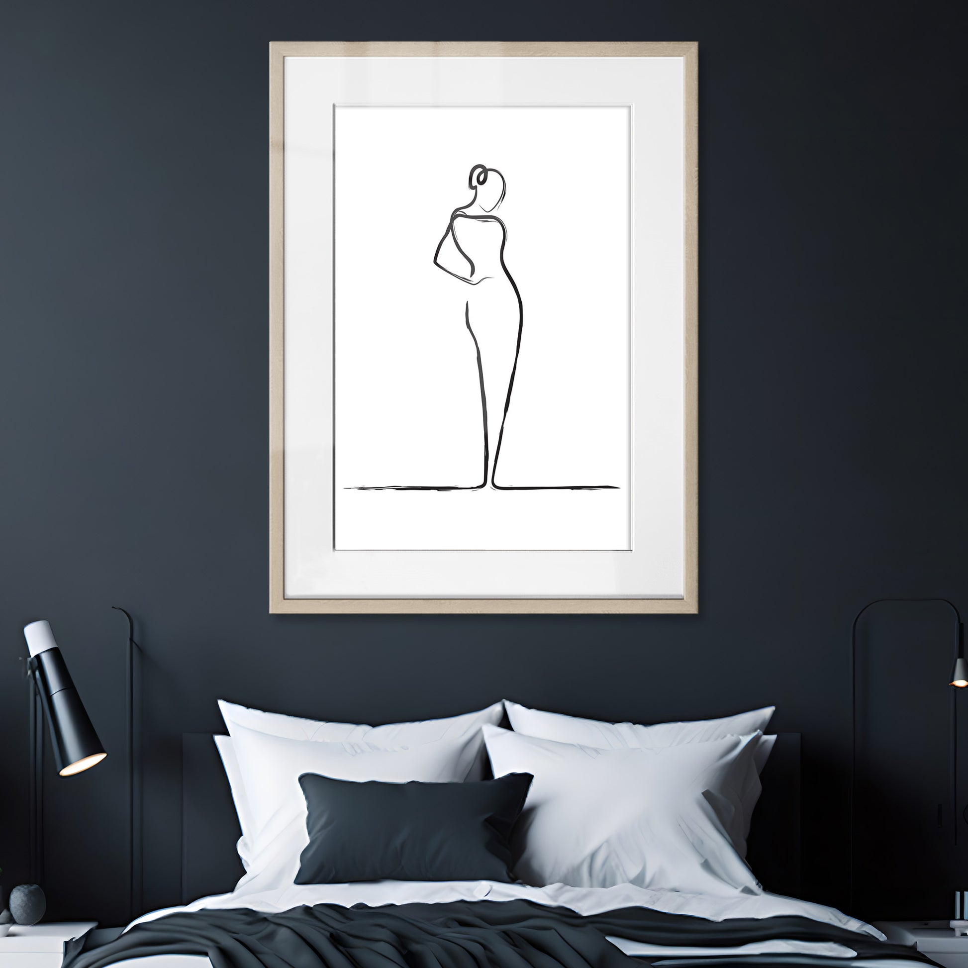 Elevate your space with this stunning line drawing of an elegant woman in a flowing gown. Rendered in minimalist style, this Framed Art Print captures timeless sophistication and grace. Perfect for adding a touch of refined charm to any room, from bedrooms to living spaces. The delicate linework celebrates feminine beauty and fashion with understated glamour. A versatile piece that complements both contemporary and classic interiors, bringing an air of cultured elegance to your walls.