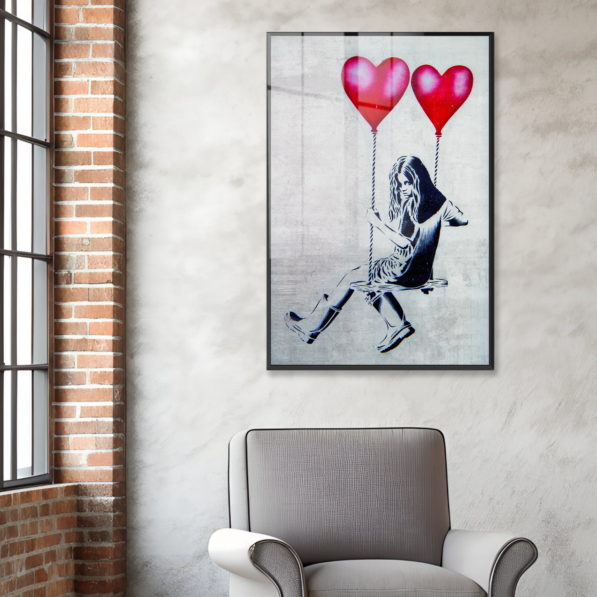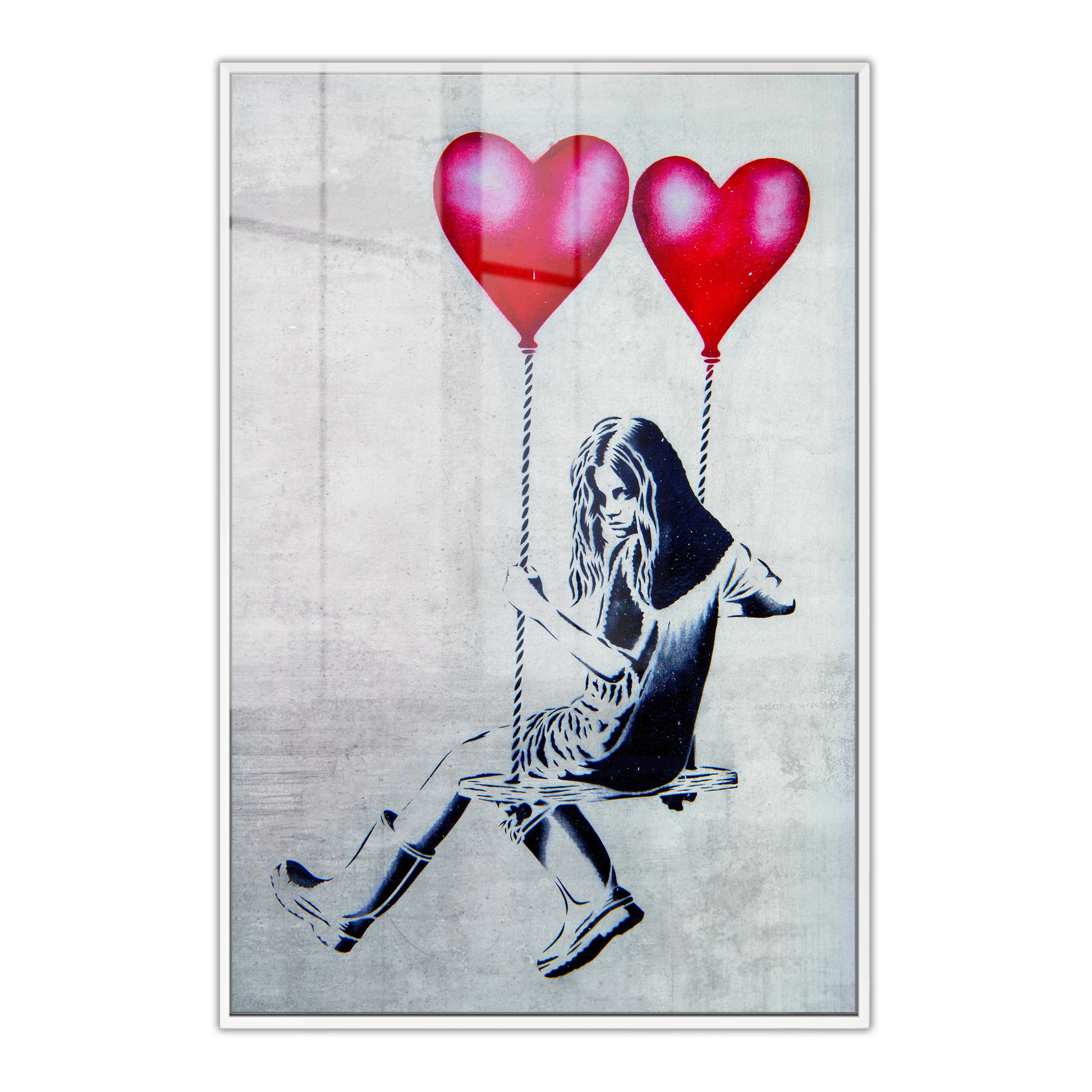 Discover the perfect statement piece for your walls with this striking Banksy-style Acrylic Art Print. Featuring a rebellious girl swinging on heart-shaped balloons, this bold graffiti artwork brings edgy charm and personality to any room. With its playful yet provocative aesthetic, it's ideal for those who dare to express themselves through their home décor. A conversation starter that celebrates individuality and artistic flair.
