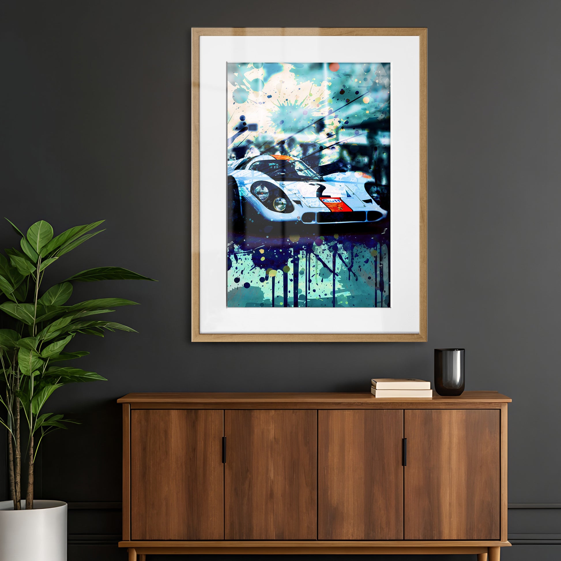 This bold graffiti-style Framed Art Print brings the legendary Porsche 917K to life with street art flair. Splashed across your wall in vibrant colours and dynamic brushstrokes, this 1970 Daytona-winning Gulf Edition machine becomes pure visual rebellion. Perfect for race fanatics who want their passion displayed with attitude, this print merges high-octane motorsport heritage with contemporary urban art. Transform any space into a garage gallery that screams speed, style, and pure petrolhead pride.
